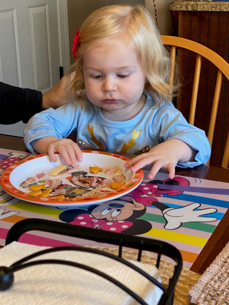 Vienna happy with her own plate & seat at the table -- no more highchair!