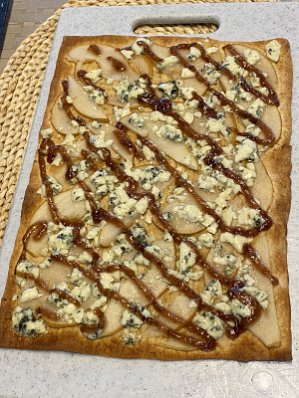 Ready to eat - copycat pear, bleu cheese, and fig flatbread from Harvest Grill
