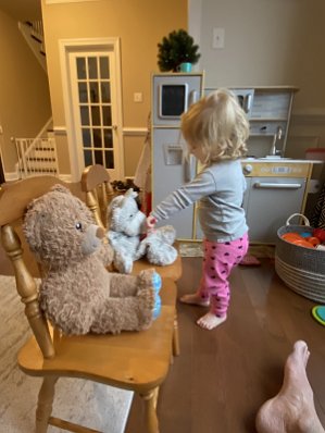 Feeding her cow with Nolan's 'OG' bear waiting his turn