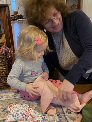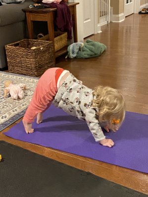 Vienna doing "yoga yoga" [note #1 - position of her toes] [note #2 - below her shirt -- band of skin, white band of diaper, red band of Nolan's underwear, and…