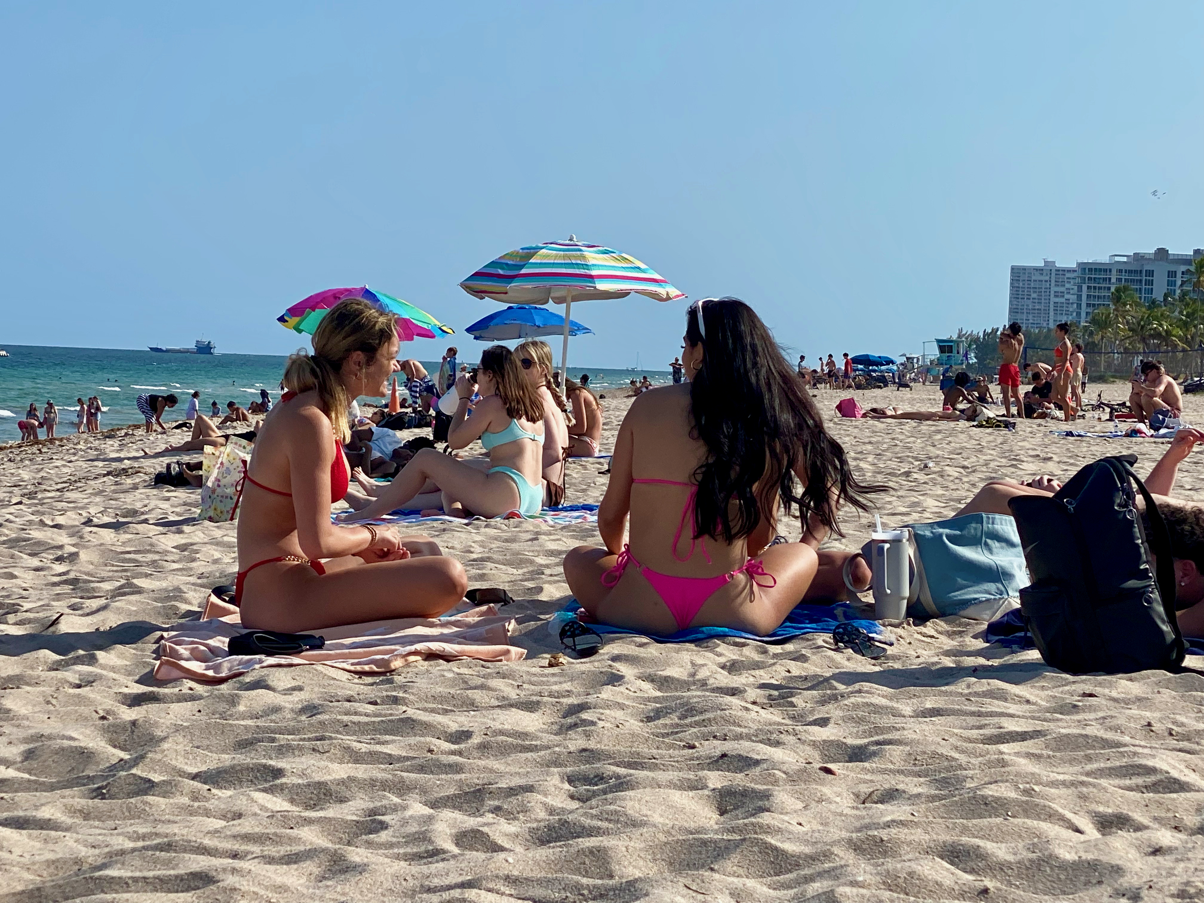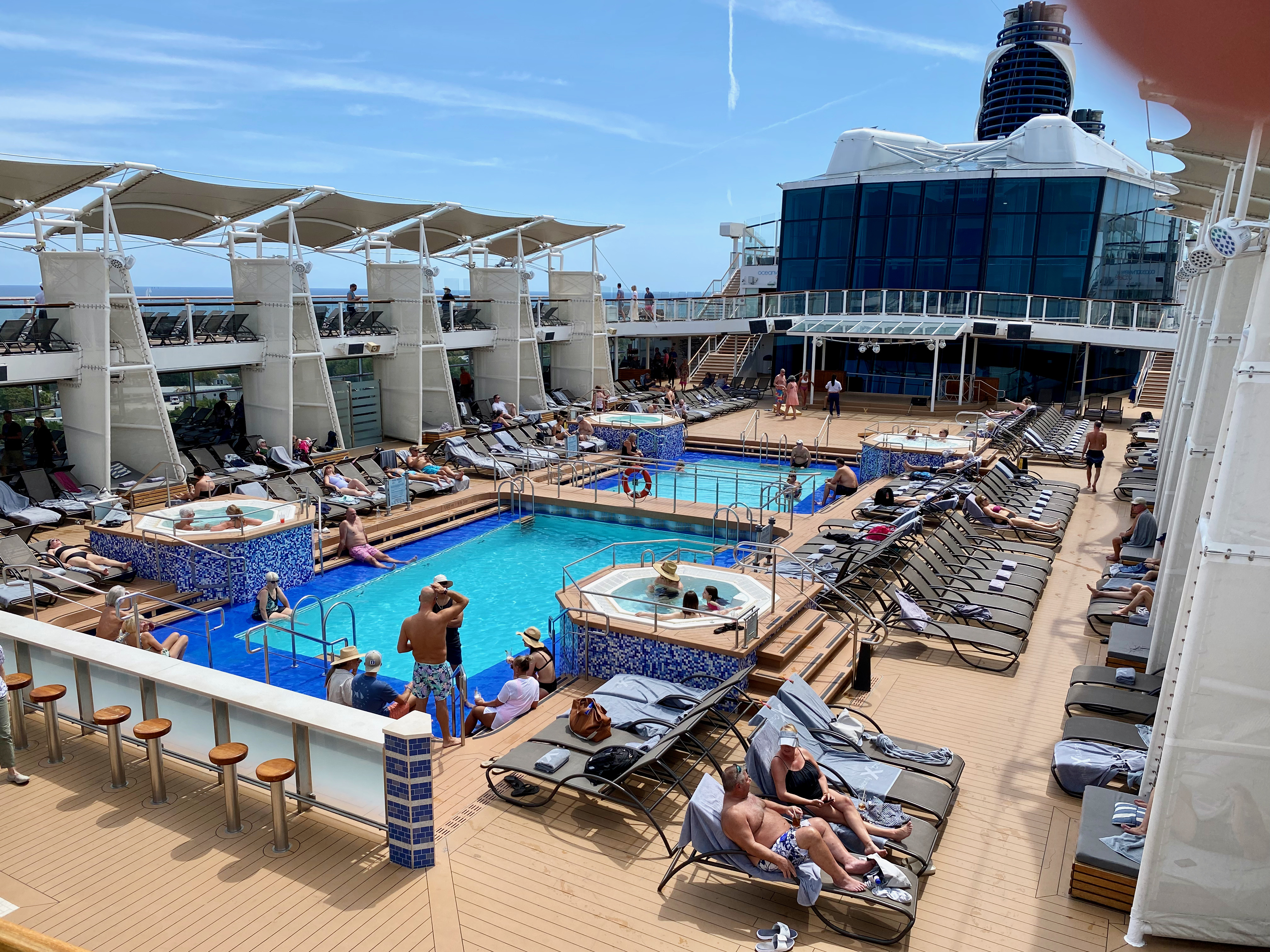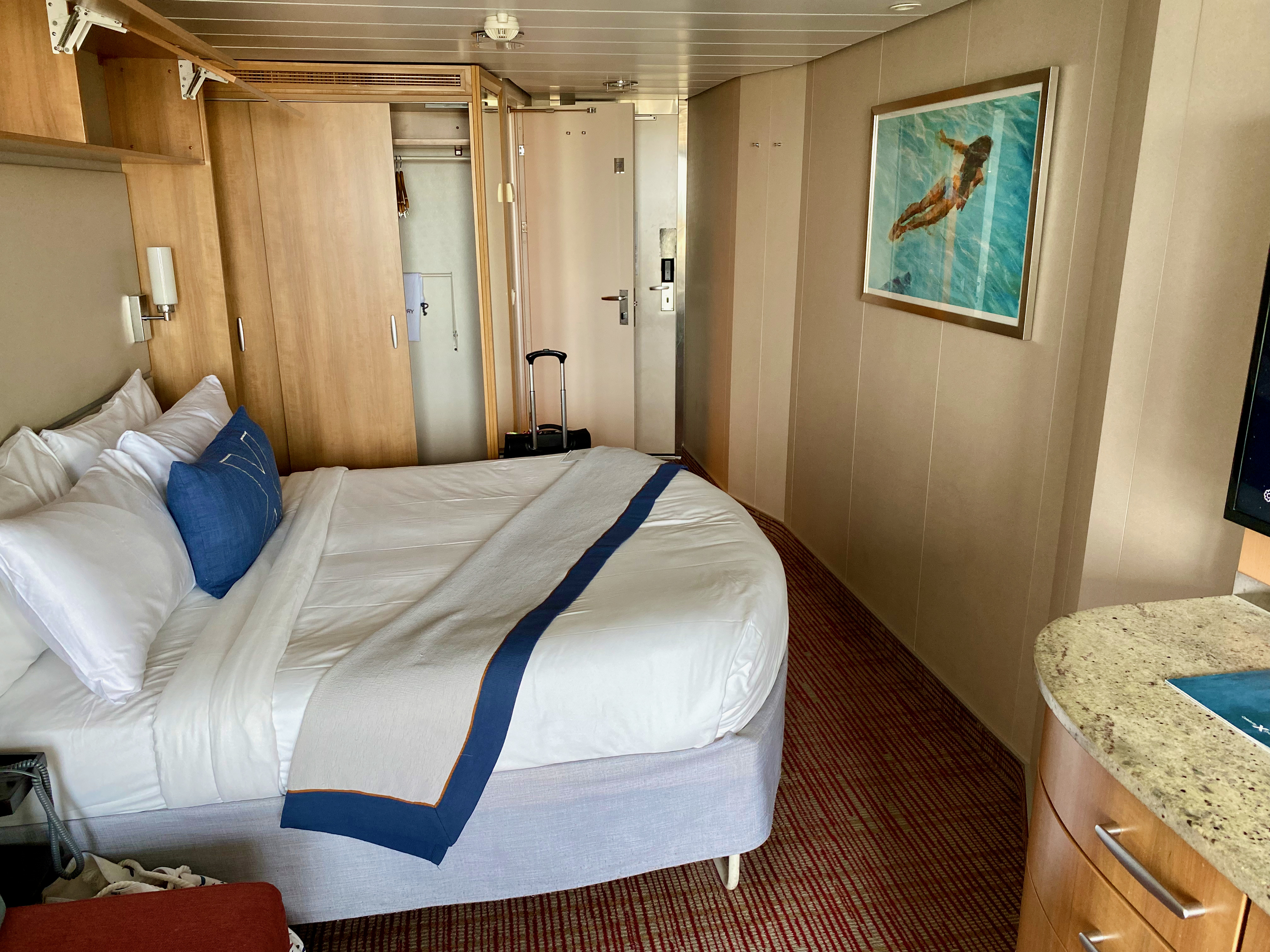 Over the coastline, just north of Fort Lauderdale Bubba Gump: Classic burger w/avocado + fries Lots of fancy cars on the street Diver at International Swimming Hall of Fame tower International Swimming Hall of Fame diver - video Beach scene - Las Olas Beach scene - Las Olas - view looking north Another beach scene Watching the Disney Dream leaving Fort Lauderdale [we were on this ship a month later] Sunset over Fort Lauderdale Beach at dusk Yacht in Intercoastal Waterway View of Marriott Courtyard Beach from the beach Michael ready to board the Equinox at Port Everglades - pier #25 Sonia walking up the gangway Michael stepping off the gangway onto the Equinox @ 12:42 PM Our cabin - looking from balcony to closet, bathroom, and cabin door Reverse view: across bed, dresser, couch, balcony sliding door, and balcony Looking from our balcony toward our hotel [far right of center]. Bottom of navigation bridge visible at top of picture. View of the Equinox main outdoor pools