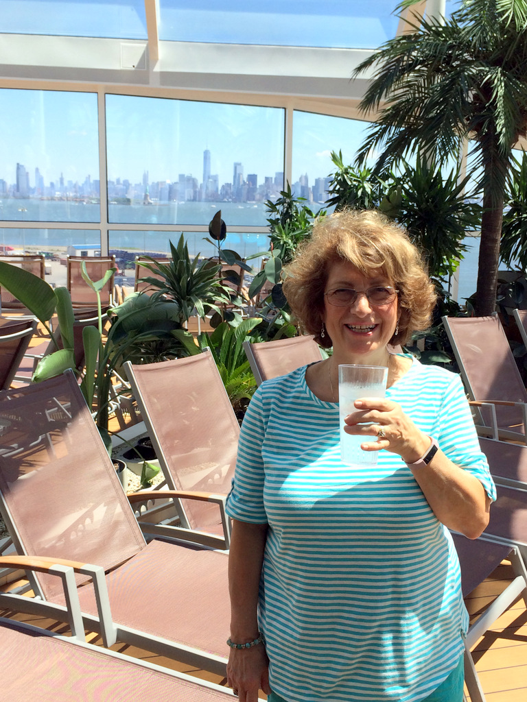 First drink on board -- just ice cold water! -- NYC in background