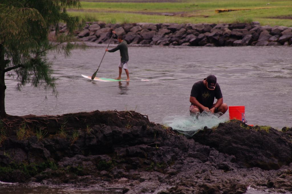 Fisherman checking his net with paddler in the background at Wailoa River mouth