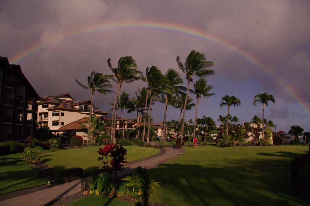 Sonia [in red] admiring full rainbow over our condo