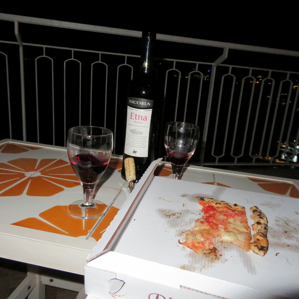 Leftover pizza and wine nightcap on our terrace in Sorrento