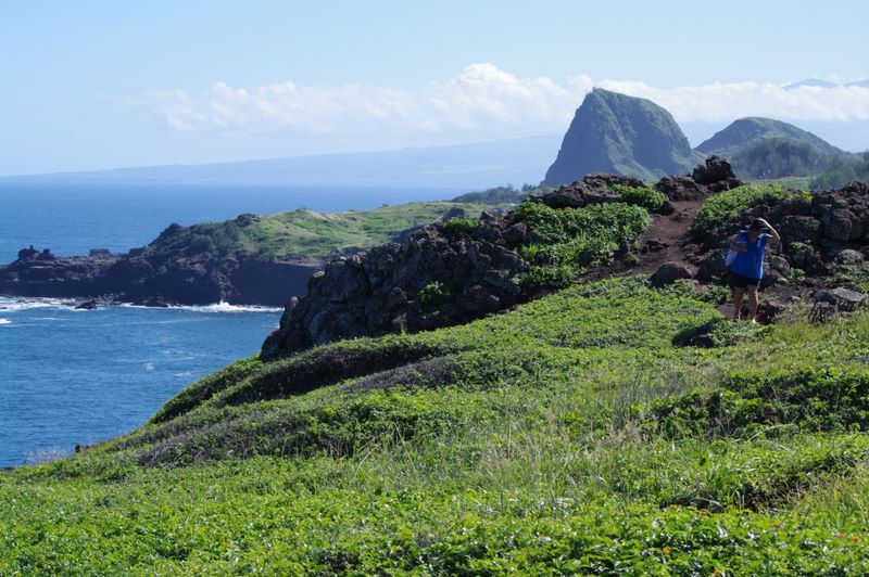 maui2011 -- Sonia on the hiking trail with Kahakuloa Head in the background